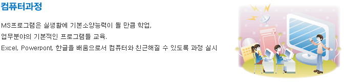 ◈ 사무자동화반( 재직자반, 일반인) 한글, 파워포인트, 엑셀프로그램의 실무중심의 활용방법을 습득. 전문사무분야에 적극 활용할 수 있돌록 실시. |